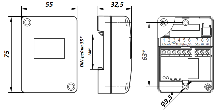9. Габаритные размеры, не более 75х55х33 мм.