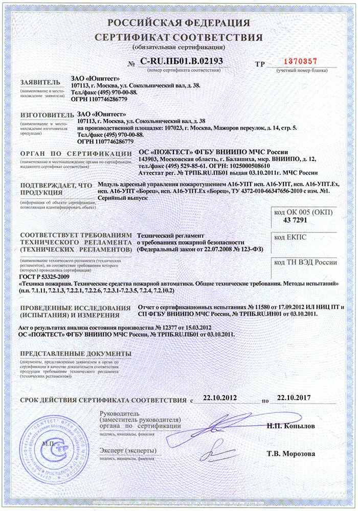 Модуль адресный управления пожаротушением А16-УПТ и А16-УПТ.Ех Срок действия до: 22.10.2017 г. |