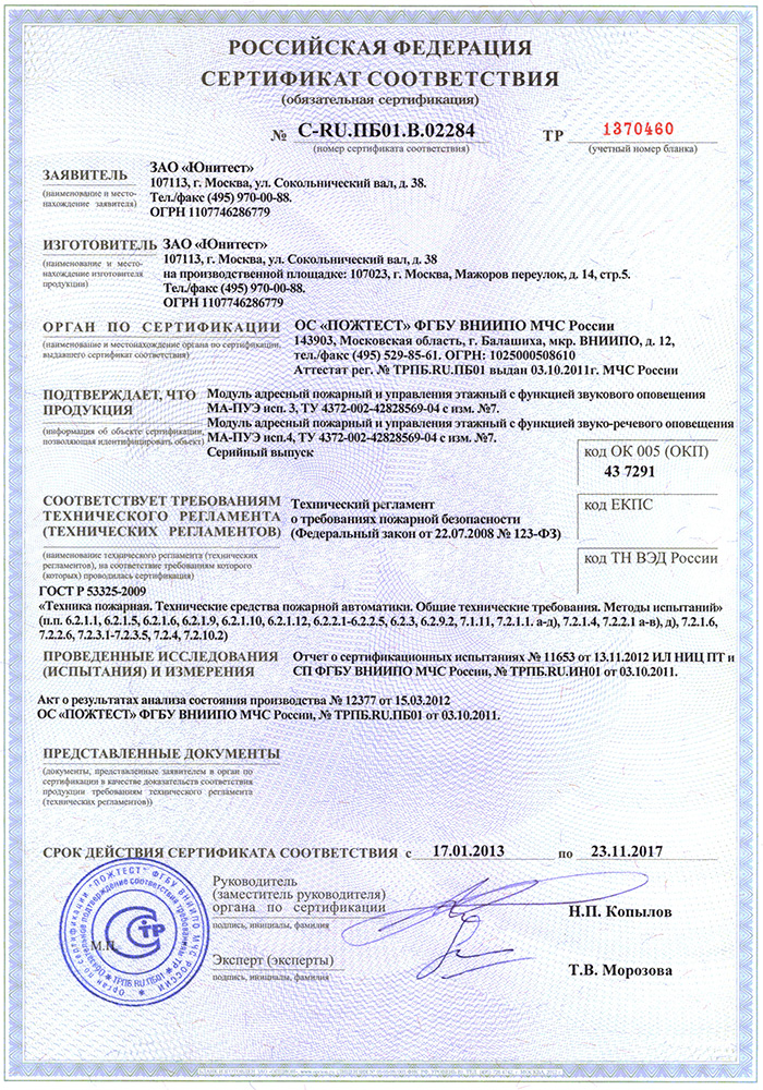 Модуль адресный пожарный и управления МА-ПУЭ исп.3 и МА-ПУЭ исп.4 Срок действия до: 23.11.2017 г. |