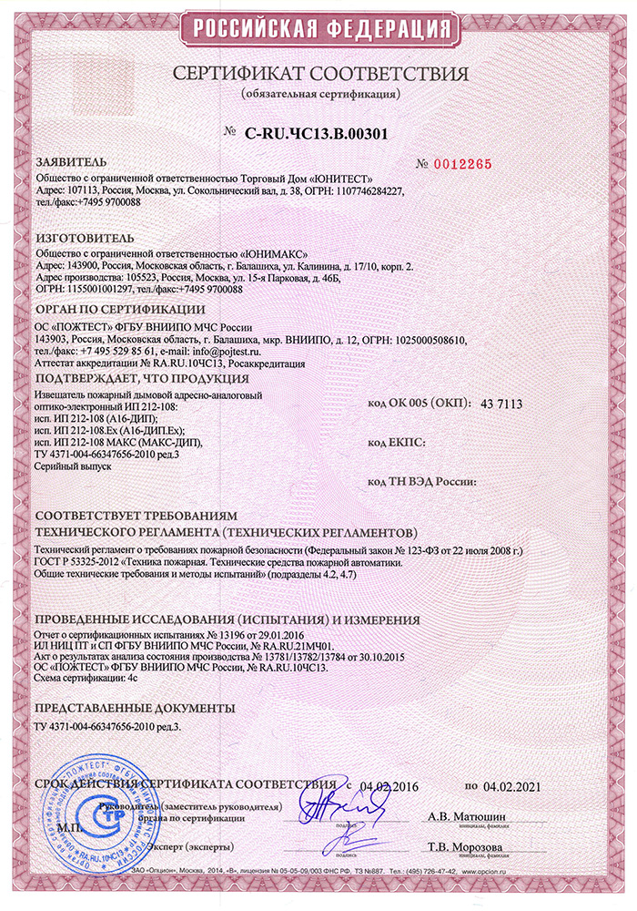Извещатели А16-ДИП (ИП 212-108), А16-ИПТ (ИП 101-50) и А16-ИПГ (ИП 435-7) ИП 212-108 (А16-ДИП) исполнения: ИП 212-108.Ех (А16-ДИП.Ех), ИП 212-108 МАКС, ИП 212-108.Ех МАКС, ИП 212-108 МАКС исп.РЛ, ИП 212-108 МАКС-LT, ИП 212-108 МАКС-LT исп.РЛ ИП 101-50 (А16-ИПТ) исполнения: ИП 101-50.Ех (А16-ИПТ.Ех), ИП 101-50 МАКС (МАКС-Т), ИП 101-50.Ех МАКС (МАКС-Т.Ех), ИП 101-50 МАКС исп.РЛ (МАКС-Т исп.РЛ) ИП 435-7 (А16-ИПГ) исполнения: ИП 435-7.Ех (А16-ИПГ.Ех), ИП 435-7 МАКС (МАКС-СО), ИП 435-7.Ех МАКС (МАКС-СО.Ех) Срок действия до: 22.06.2026 г. |