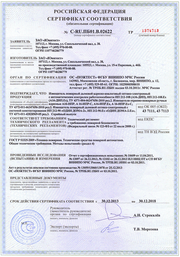 Извещатели ИП 212-90 "ОДИН ДОМА-2", ИП 212-90.Ех "ОДИН ДОМА-2.Ех" А также: ИП 212-108 (А16-ДИП), ИП 212-108.Ех (А16-ДИП.Ех), А16-ИПР, А16-ИПР-С, А16-ИПР.Ех, А16-ИПР.Ех-С Срок действия до: 30.12.2018 г. |