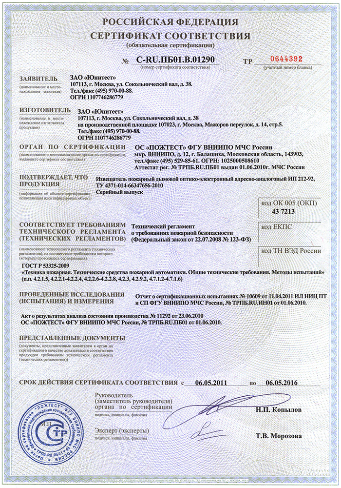 Извещатель ИП 212-92 Срок действия до: 06.05.2016 г. |