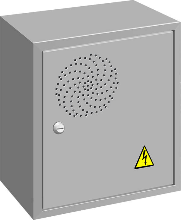 - Шкаф представляет собой металлический корпус, состоящий из основания и дверцы с отверстиями для звучания оповещателя модуля МА-ПУЭ.