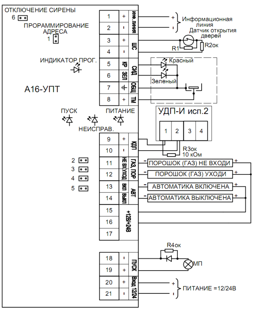 Схема подключения нескольких модулей пожаротушения ("МП") к А16-УПТ, контроль цепей модулей пожаротушения не обеспечивается.